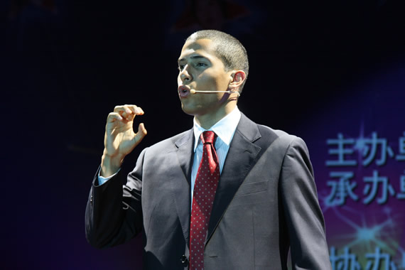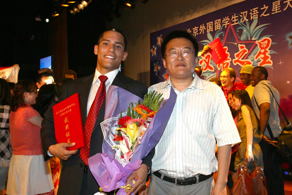 “汉语之星”冠军穆雷和指导教师王国庆合影