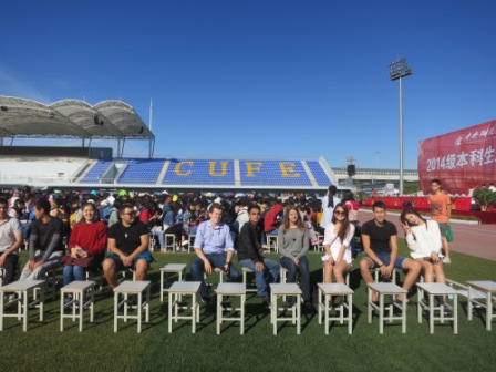 9月15日,学校“2014级本科生开学典礼”在沙河校区运动场举行。永利官网2014级本科国际新生与中国学生一起参加了典礼,聆听了校长、师长的教诲。典礼当天阳光明媚,蓝天白云之下,衬托出沙河校区格外美丽。国际新生被沙河校区的座座西式建筑深深吸引,纷纷表示要努力学习,争取能够进入沙河校区与中国同学同班学习。
