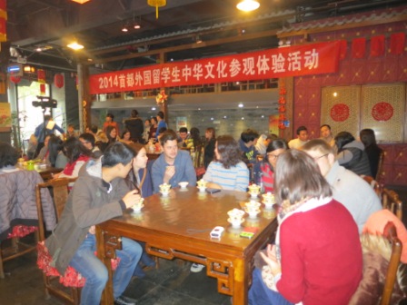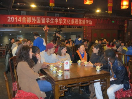 11月15日,永利官网部分国际学生参加了由北京市国际教育交流中心举办的“2014首都外国留学生中华文化参观体验活动”。留学生们来到了老舍茶馆,首先通过展览,了解了北京文化和老北京人的生活。随后在品茶中,观看了京剧、曲艺、杂技、功夫、皮影戏等的表演。留学生们无不为中国文化艺术的多样和精湛而赞叹。