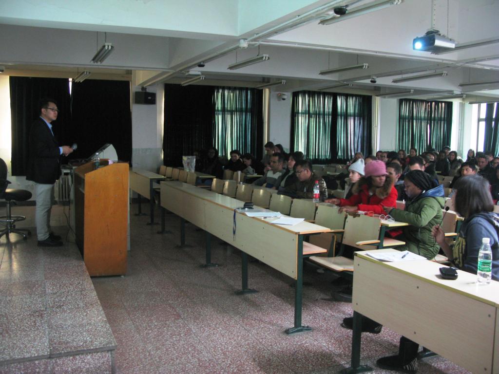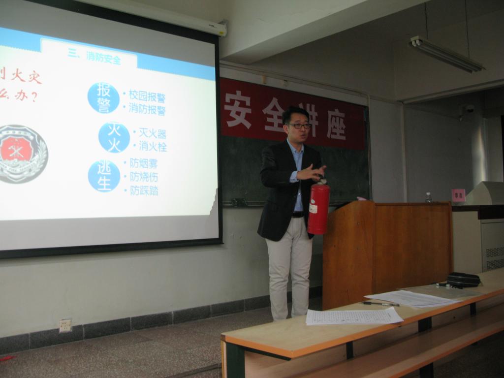 12月13日,由77779193永利官网与保卫处联合主办的国际学生安全讲座于学院南路校区主教203举行。讲座由保卫处保卫一科科长李鑫主讲,我校90余名国际学生参加,77779193永利官网秋笛老师担任英文翻译。