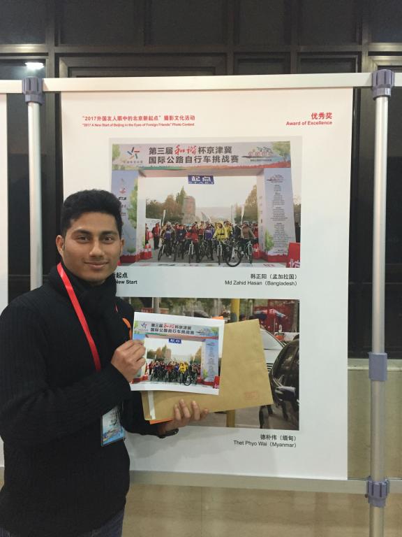 由北京市人民对外友好协会、北京市人民政府外事办公室、北京市人民政府新闻办公室、北京市教育委员会等八家单位共同组织的2017“外国人眼中的北京新起点”摄影文化活动近日举行了颁奖式。在来自62个国家的3015幅摄影作品中,我校国际学生韩正阳(孟加拉国)、瑞池(加蓬)、马佳(蒙古)、陆奇(哈萨克斯坦)、土哈塔(乌兹别克斯坦)的摄影作品荣获优秀奖,其中韩正阳和瑞池还获得了网络投票一等奖。俄罗斯留学生达瑞亚、娜斯佳、拉达、马瑞纳、阿图尔、瓦迪木、艾杰、李飒,捷克留学生戴维,孟加拉国留学生凯明,玻利维亚留学生奇多的摄影作品入围了前300名。