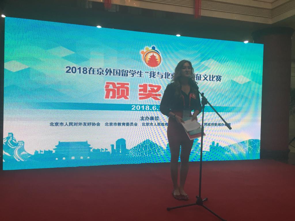 近日,由北京市人民对外友好协会、北京市教育委员会、北京市人民政府外事办公室、北京市人民政府新闻办公室主办的“2018在京外国留学生‘我与北京’主题征文比赛”举行了颁奖式。在27个国家487名在京留学生参加的征文比赛中,我校国经贸专业二年级本科留学生李飒同学的作文《我的中国心》荣获了一等奖,并且在颁奖式上代表获奖者发言。
