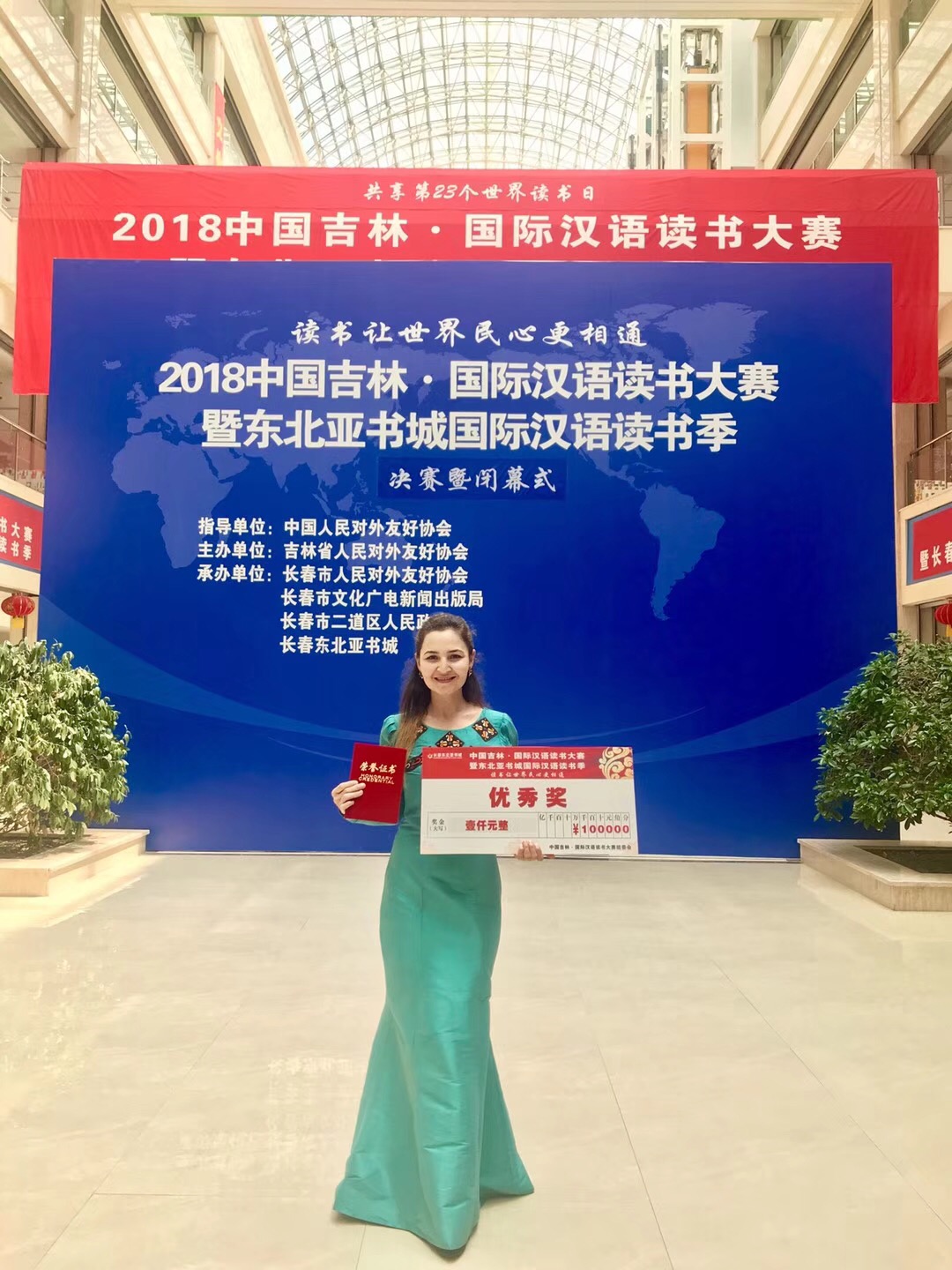 近日,由吉林省人民对外友好协会主办,长春市人民对外友好协会、长春东北亚书城等承办的“2018中国吉林-国际汉语读书大赛”在长春市闭幕。100多个国家的500多名选手参加了比赛,我校金融学专业一年级硕士研究生,来自土库曼斯坦的欧拉同学获得了优秀奖。大赛上,欧拉用汉语朗读了舒婷和北岛的诗《致橡树》、《回答》,受到了评委的好评。