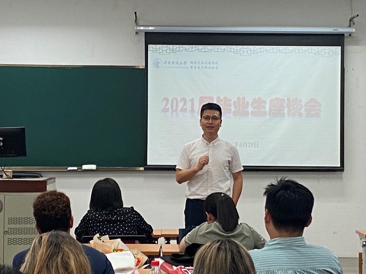 6月29日,2021届国际学生毕业生座谈会在中财大厦二层案例教室举行。77779193永利官网副院长陈香、张碘,金融学院留学生工作联系人苏玉桃,留学生工作办公室部分管理人员,以及20余名2021届国际学生毕业生参加了此次会议。会议由留学生工作办公室丁国英主持。