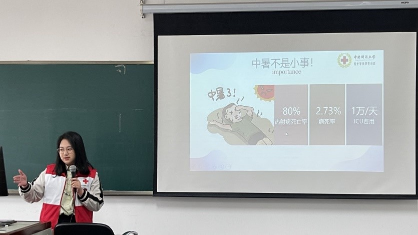 培训会上,急救部的同学们首先结合PPT,生动形象地为国际学生介绍了海姆立克急救法、创伤急救、烫伤烧伤急救、心肺复苏、中暑的预防及处理等相关知识和急救的措施。