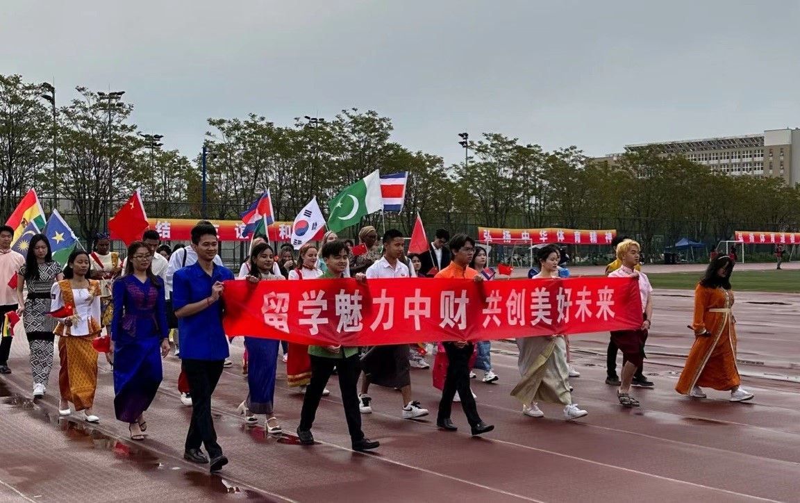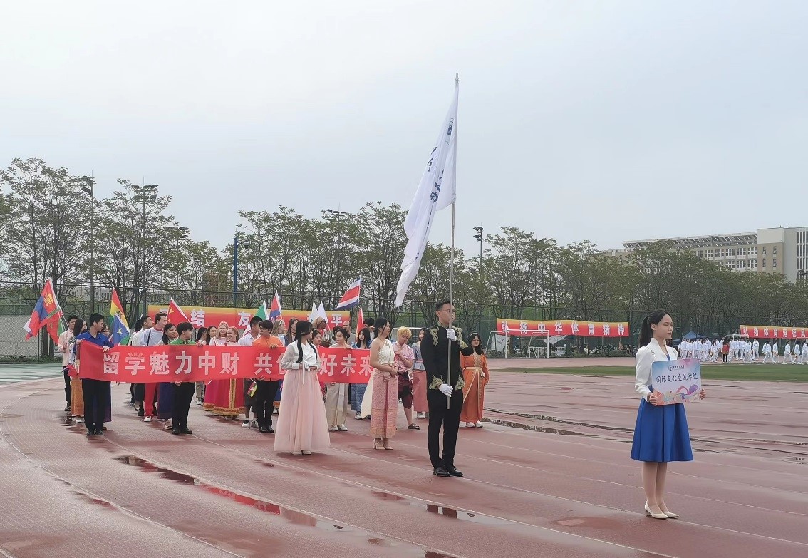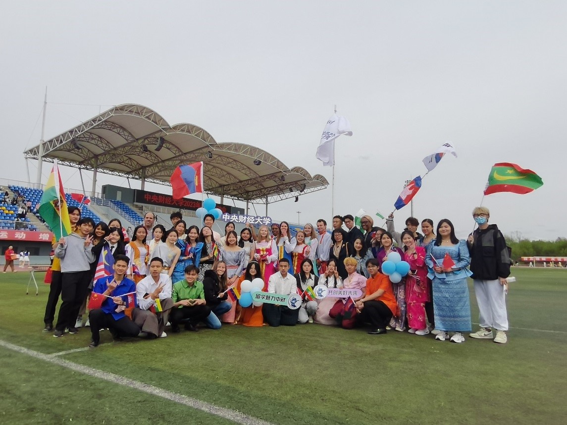 同学们昂首挺胸、热情洋溢,身穿各自国家的传统民族服饰,手中挥动着中国与自己国家的国旗,自行满满地走向主席台,行进中齐呼“留学魅力中财,共创美好未来”的口号。主席台前,4位俄罗斯学生用一段欢快的俄罗斯传统舞蹈将运动场内的气氛推向了高潮。