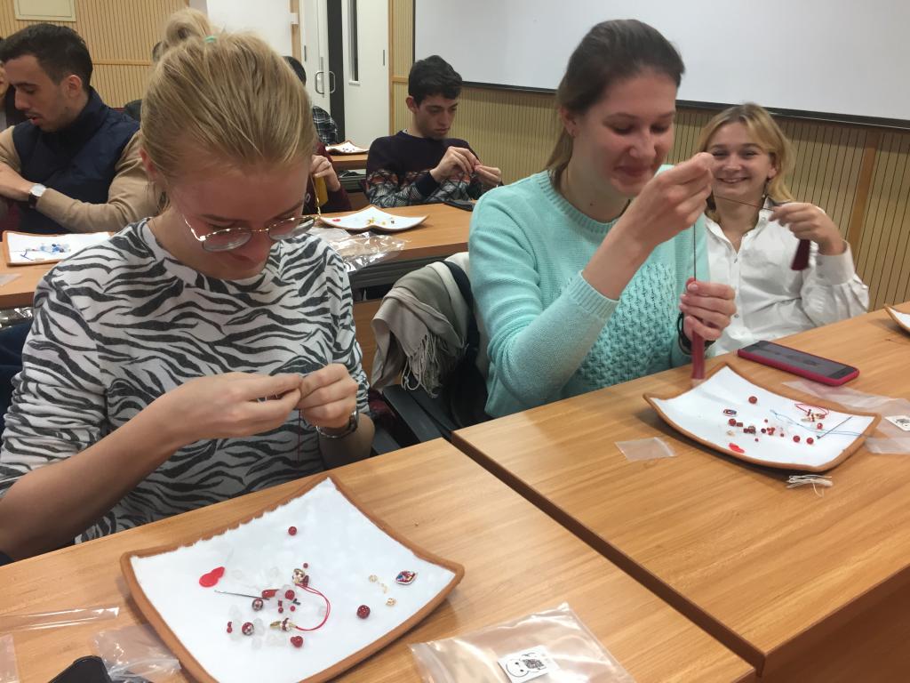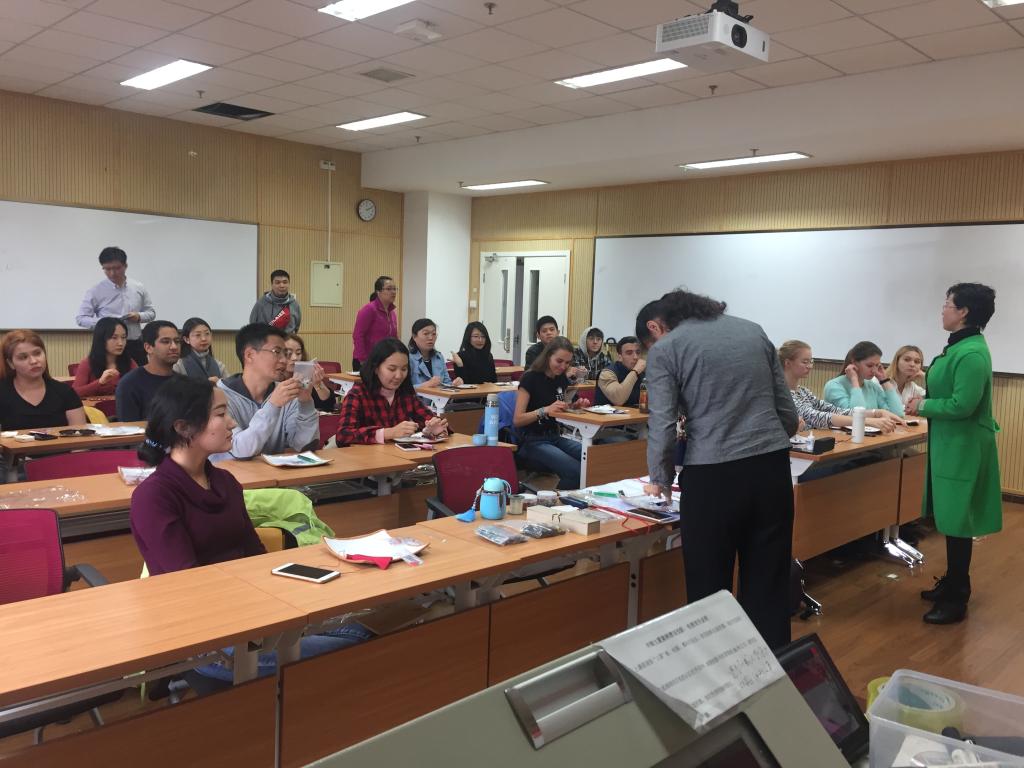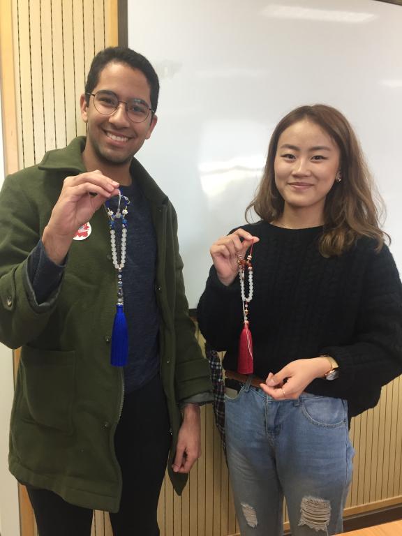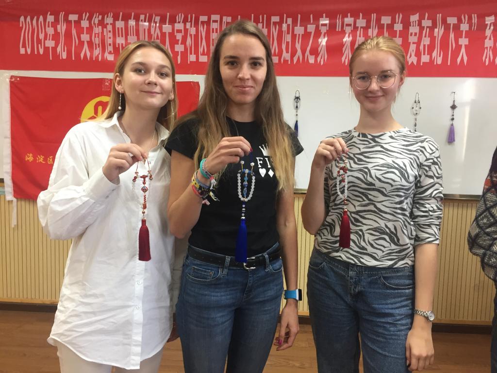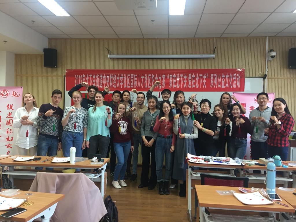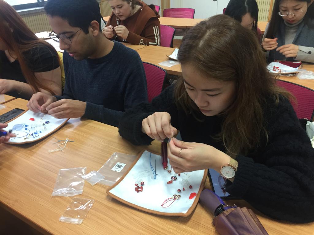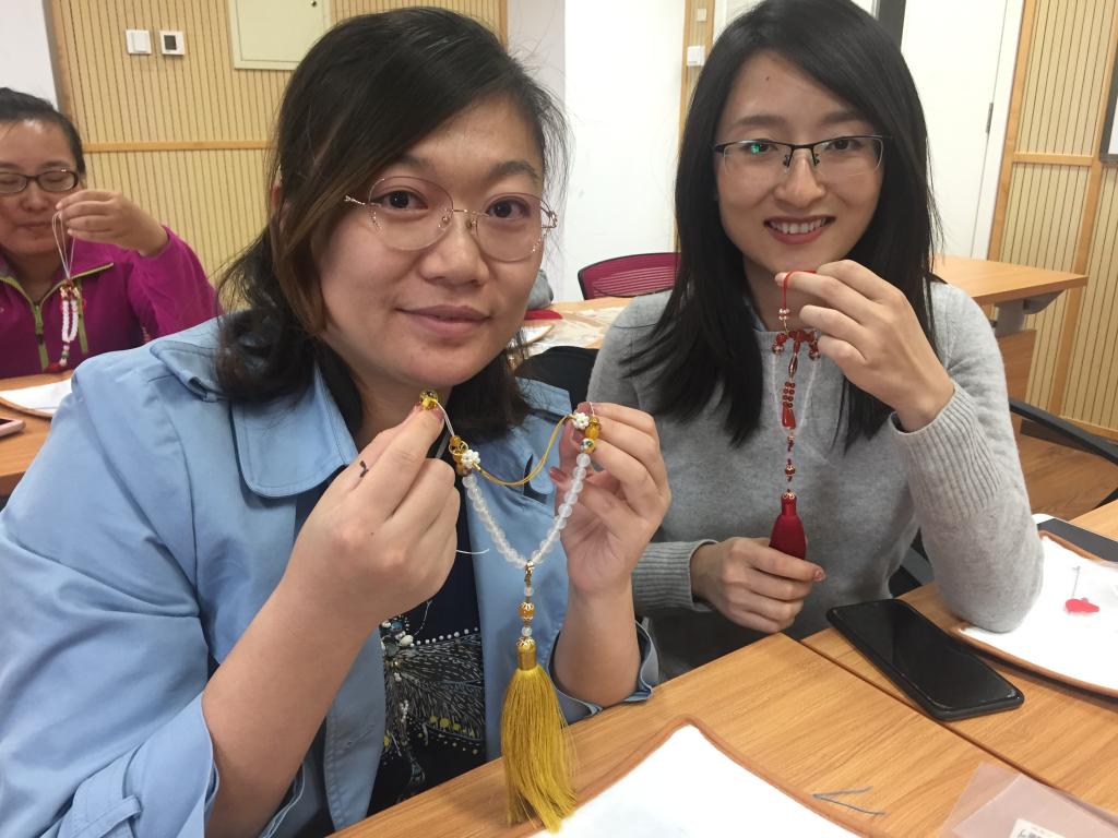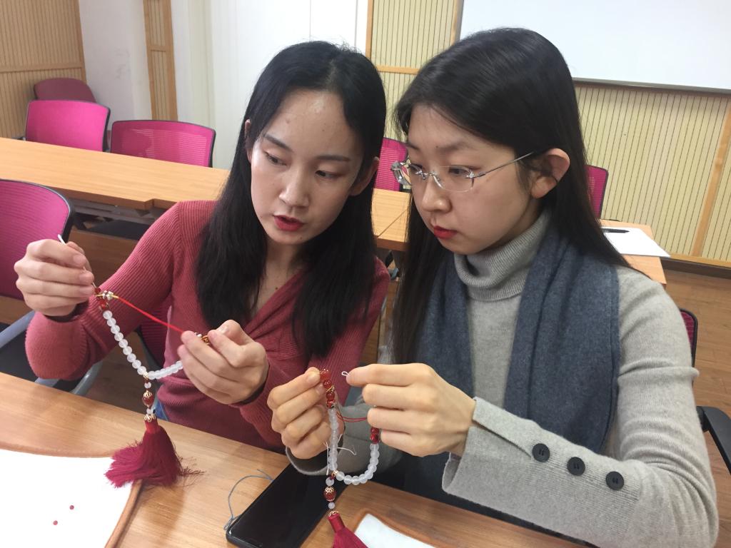 压襟是古代女性胸前的主题装饰品,多在节日或喜庆场合时佩挂于衣襟的右上方,即可用来装饰,又可美化固定衣襟。为使师生更好地体验中国传统文化,发挥女性心灵手巧,善作女红的天然优势。10月24日,在北京下关街道妇联的指导下,永利官网和学校社区妇联联合举办了“传统压襟”制作活动,学院女教工和留学生一起,将大小、颜色不同的珠子串连在一起,在两个小时内,制作出了精美的饰品,激发了师生对手工制作的兴趣。
