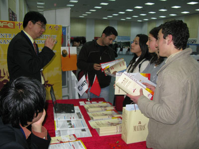 土耳其大学教育部外事总司司长易卜拉欣在我校展台前鼓励学生到中国留学