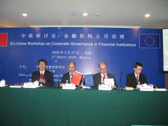 “中欧世贸项目(EU-China Trade Project)”方面聘请了英国剑桥大学 Kern Alexander教授、德国联邦金融监管局(BaFin)高级法律顾问 Robert Elsen先生、富通集团(Fortis Group)首席经济学家 Freddy Van den Spiegel博士以及毕马威华振会计师事务合伙人田继文女士到会演讲。他们分别以金融监管的作用、通过监管增强金融机构的公司治理、欧盟成员国金融监管机构的经验、合资公司的公司治理以及中国新企业会计准则对公司治理的影响等为主题发表了演讲。