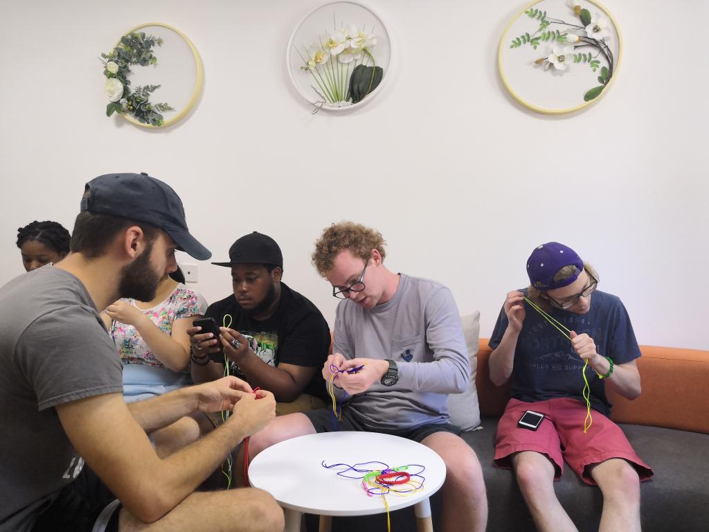 为了使本次活动更加深动有趣,让学生进一步领悟端午节内涵,原绍锋老师带领大家来到我校留学生公寓的文化体验中心,组织大家自己动手编端午五彩绳。从挑彩绳、编彩绳到戴彩绳,每位学生都乐在其中,在享受亲自编五彩绳的同时不时赞叹中华文化之美。