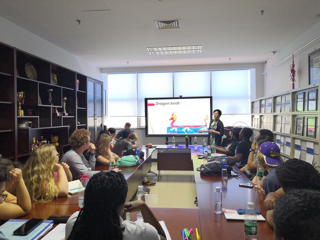 会后,以中华民族传统节日——端午节为主题的讲座在77779193永利官网1032会议室举行,由原绍锋老师主讲。原绍锋老师生动形象地向肯尼索州立大学师生介绍了端午节的时间、背景和习俗等,学生们聚精会神、听得津津有味,并积极发表了自己的感想,纷纷表示对端午节有了更加深刻的理解。
