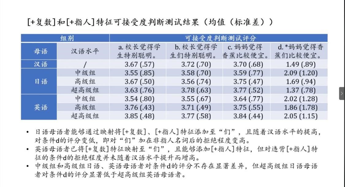 接下来,赵教授以自己最近的研究成果“英语母语者与日语母语者汉语复数标记“们”的习得研究”为例,向大家介绍了如何开展基于特征重组假说的汉语习得实证研究。他从实验被试、实验方法、实验工具、测试句的使用、实验结果等诸多方面对自己的研究成果进行了细致的讲述与分析。赵教授根据自己的研究结果指出:不同特征的习得难度有异,需要重组的特征难于由一语映射的特征,这与特征重组假说的预测相一致。