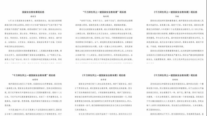 在观看公开课的过程中,全体教职工和中国籍学生学习了总体国家安全观的基本内涵:政治安全、国土安全、军事安全、经济安全、文化安全、社会安全、科技安全、网络安全、生态安全、资源安全、核安全、海外利益安全、生物安全、太空安全、极地安全、深海安全于一体的国家安全体系。同时,还学习了维护国家安全的重要意义以及可能会危害到国家安全的不当行为和其他国家安全相关知识,并且还学习了如何防范当前愈发猖獗的电信诈骗等不法行为。