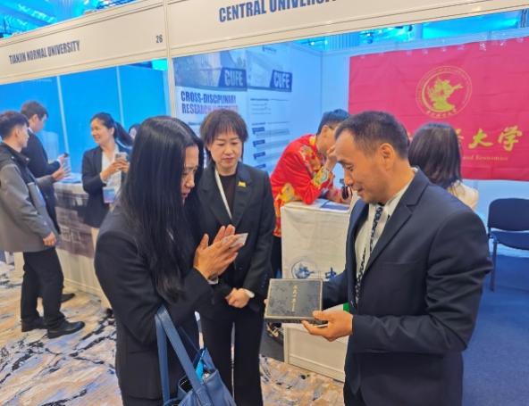 哈萨克斯坦国际信息大学副校长到我校展台前洽谈合作事宜
