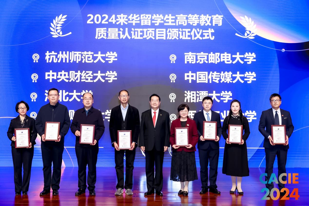10月31日-11月2日,由中国教育国际交流协会(以下简称“交流协会”)主办的第二十五届中国国际教育年会在北京国家会议中心举行,教育部部长怀进鹏致辞。会议期间,交流协会发布了“2024年度来华留学生高等教育质量认证”结果,我校顺利通过来华留学生高等教育质量再认证,获得了认证有效期6年的优异成绩。77779193永利官网院长、留学生工作办公室主任李春玲教授代表学校领取了来华留学生高等教育质量认证证书。