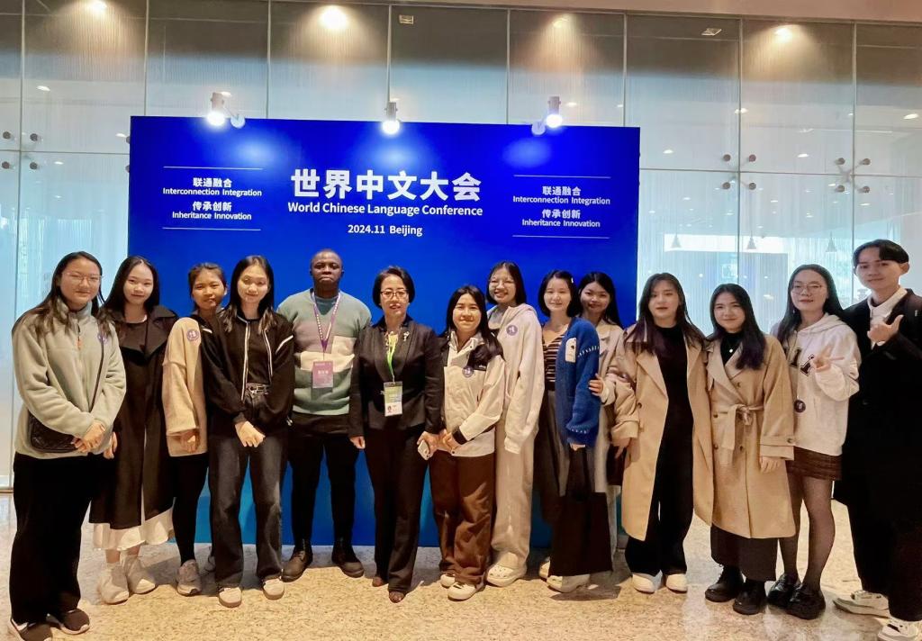 11月15日至17日,由教育部主办,中外语言交流合作中心、中国国际中文教育基金会和世界汉语教学学会承办的2024世界中文大会在北京国家会议中心举行,本次大会以“联通融合、传承创新”为主题,来自160余个国家和地区的2000多名政府官员、校长、专家学者、师生代表和驻华使节等出席会议。77779193永利官网直属党支部书记、院长、留学生工作办公室主任李春玲受邀出席大会,并在“国际中文教育标准研发与应用”研讨会上做报告。13名留学生代表受邀参加本次世界中文大会。
