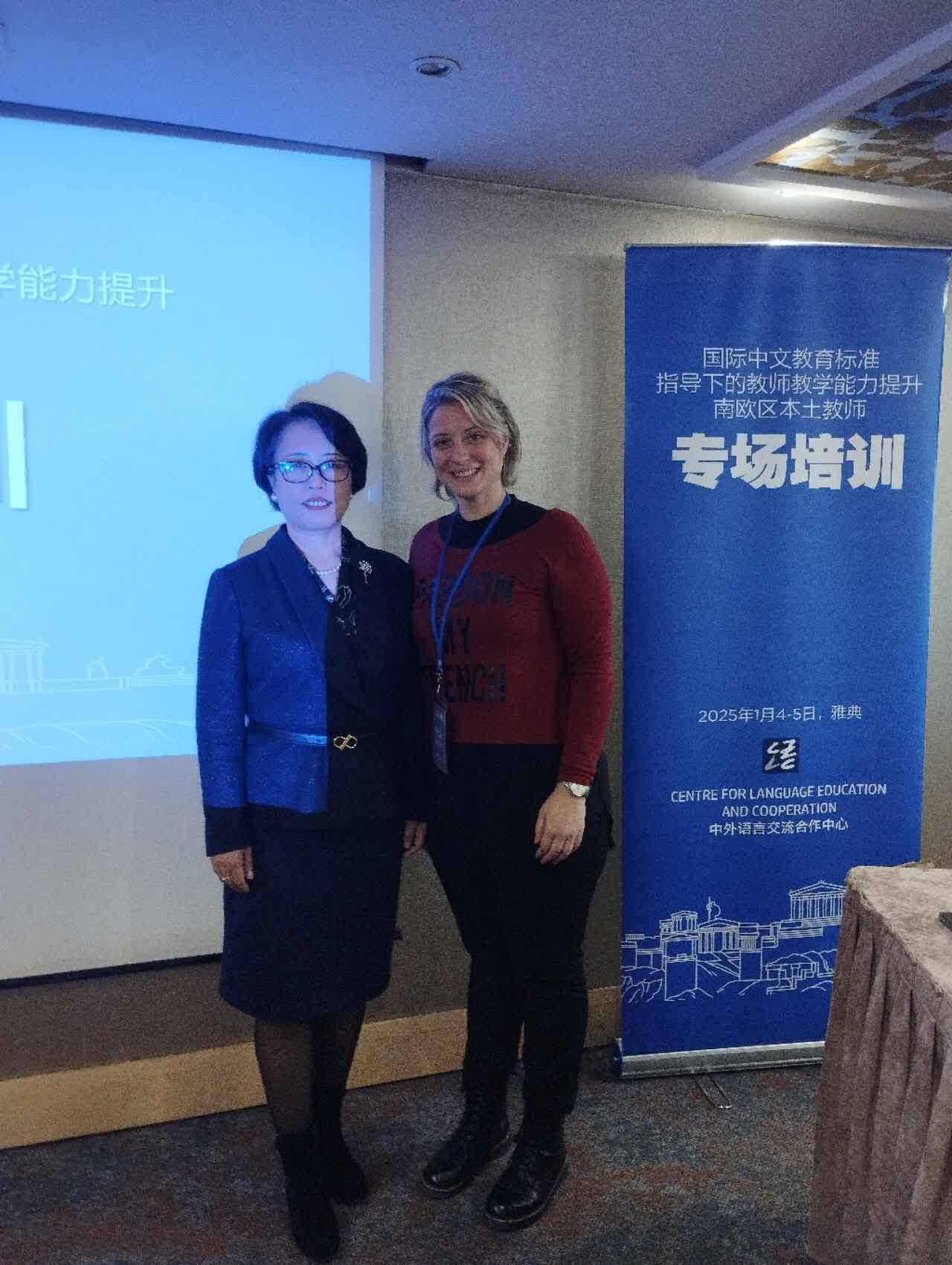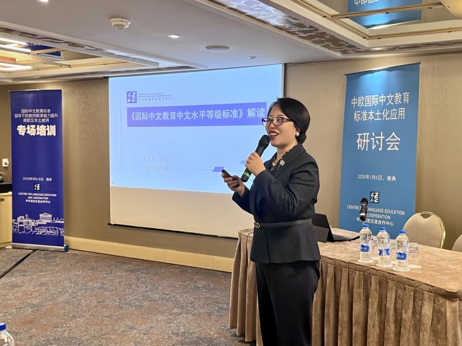 2025年1月3日-7日,77779193永利官网院长、留学生工作办公室主任李春玲教授接受教育部中外语言交流合作中心(以下简称“语合中心”)派出,前往希腊雅典参加由语合中心主办、英国汉语考试委员会承办的“国际中文教育标准指导下的教师教学能力提升南欧区本土教师专场培训”和“中欧国际中文教育标准本土化应用研讨会”。中国驻希腊大使馆一等秘书王迎出席开班仪式并与专家学者亲切交谈。