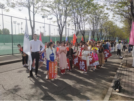 方阵中的同学们身姿挺拔,昂首阔步,展现出意气风发的精神风貌。他们身着极具本国特色的传统服饰,色彩斑斓的服饰如同多元文化碰撞出的绚丽火花,尽显世界各地的独特魅力。在行进过程中,同学们手中挥舞着鲜艳的五星红旗与各自国家的国旗,步伐坚定而自信,彰显出对不同文化的尊重与融合。当方阵行至主席台前,同学们齐声高呼“丝路连心创佳绩,龙马精神勇争先” 的响亮口号,传递出他们积极向上、勇于拼搏的决心与信念。