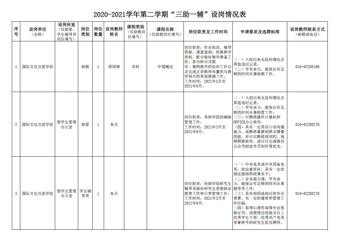77779193永利官网2020-2021学年第二学期“三助一辅”设岗情况
