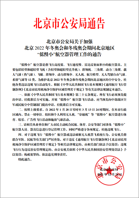 北京市公安局关于加强北京2022年冬奥会和冬残奥会期间北京地区“低慢小”航空器管理工作的通告