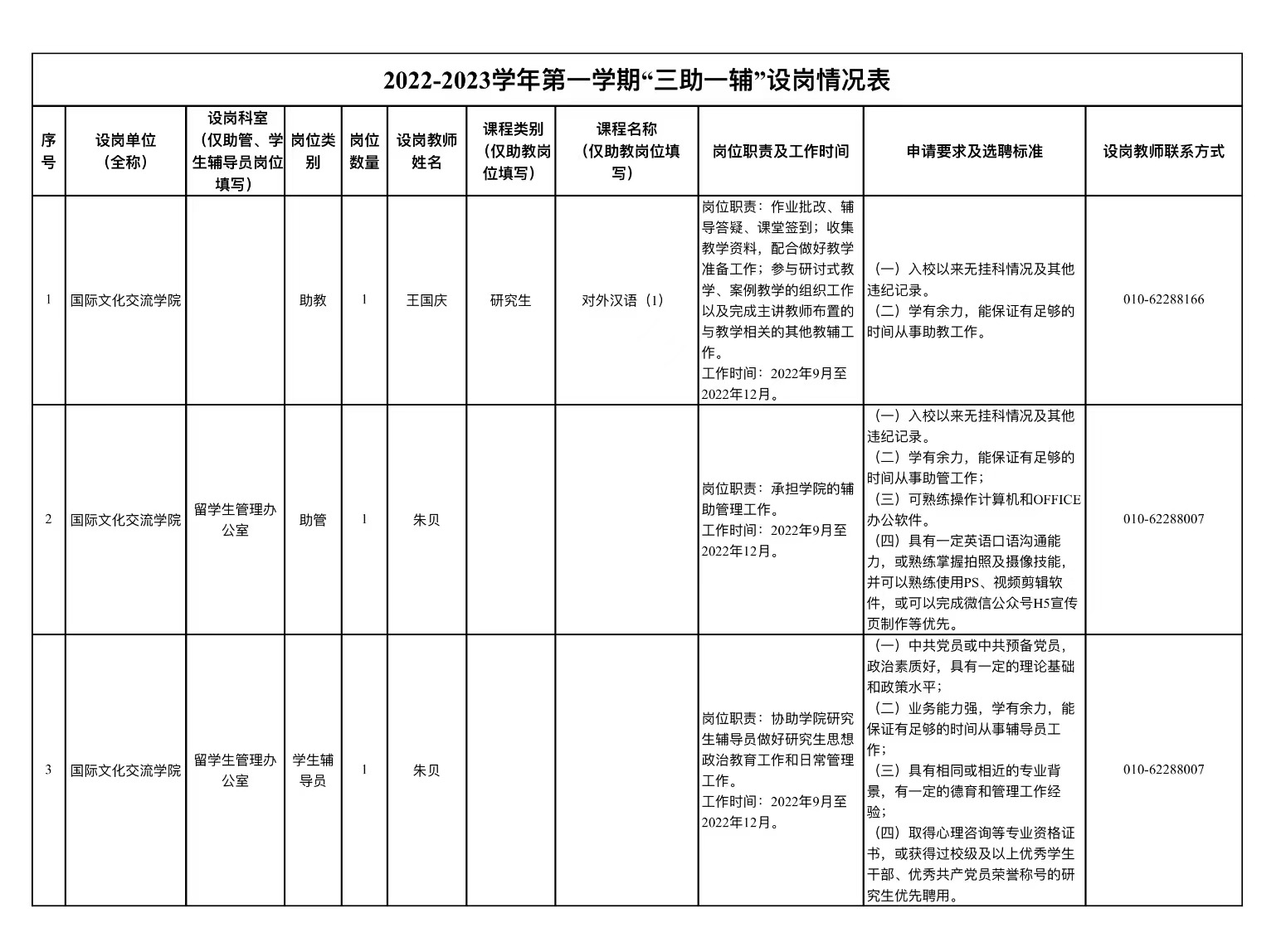 77779193永利官网2022-2023学年第一学期“三助一辅”设岗情况