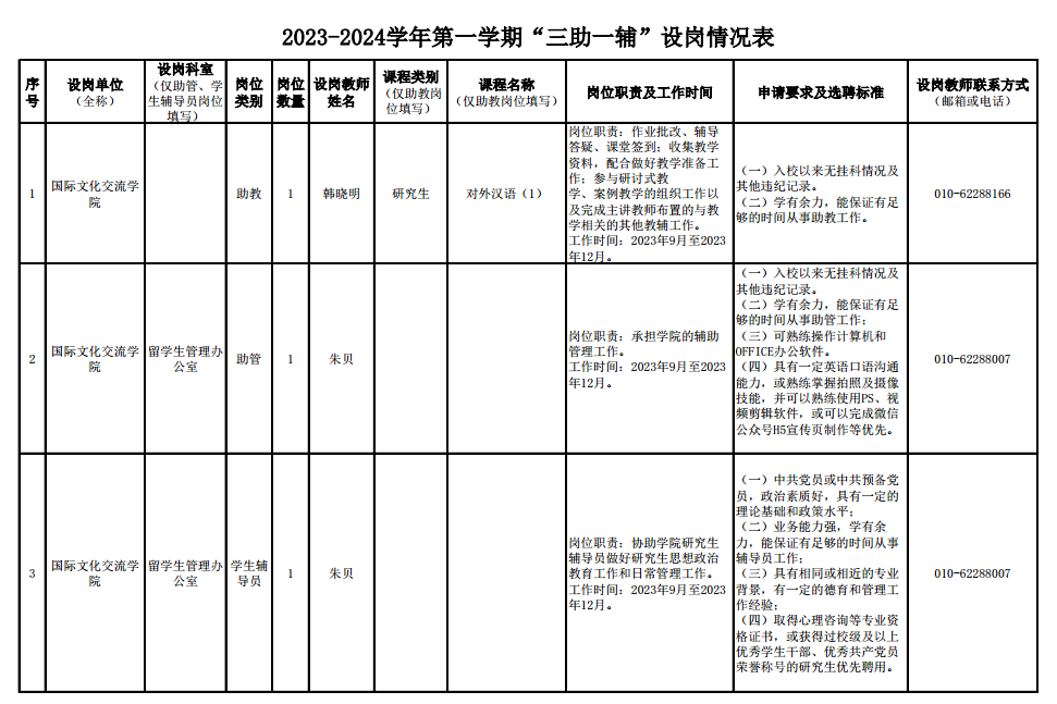 77779193永利官网2023-2024学年第一学期“三助一辅”设岗情况