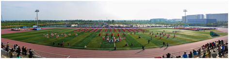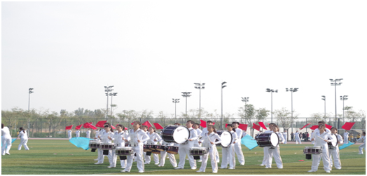 Inspired by the passionate pace and win the dream of youth. The Art Troupe of the Youth League Committee students in neat rows, entered into the field with powerful drumbeats, bringing the atmosphere again to a climax. This group was composed by 40 students, all dressed in white uniform, with multi-tone drum, snare drum, bass drum and cymbals when marching forward into the field, playing the touching Marching percussion “QiCheng” during which along with its bright, vigorous rhythms, 16 flagmen were rotating and waving the blue flags in a flag dance, using this Majestic flag dance to amaze the audience. Leaders, teachers and students on the podium and the audience have come up with their phones to record their elegant appearance. The combination of the drumbeats performances with the flag dance is a new attempt of the students from the Art Troupe of our university. This beautiful performance showed vibrant and progressive spirit of our students, and it has been welcomed and applauded by the teachers and students.