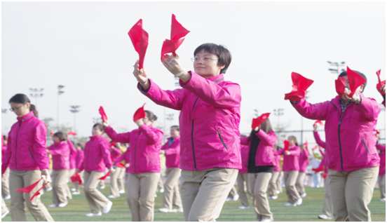 Following the 2014 autumn Games “most unusual national wind”, this year, the faculty members presented a dance with a Tibetan style, "Large plateau”. The dance began with a group composed of 10 women whom are at least 45 years old. They are all from the cleaning staff of CUFE Asset Management Company, which were dressed in beautiful Tibetan clothing, changing dancing formation from time to time, creating a beautiful scene. They were followed by the team of teachers from the school of Insurance, Law and Management Science and Engineering dressed in Tibetan clothing, or skirt. After them, the next group is a team of teachers dressed in uniforms, dancing in neat line with red silk and bamboo. This year a total of 380 faculty members participated in the Square Dance performances. The number has increased by 200 people compared to last year.