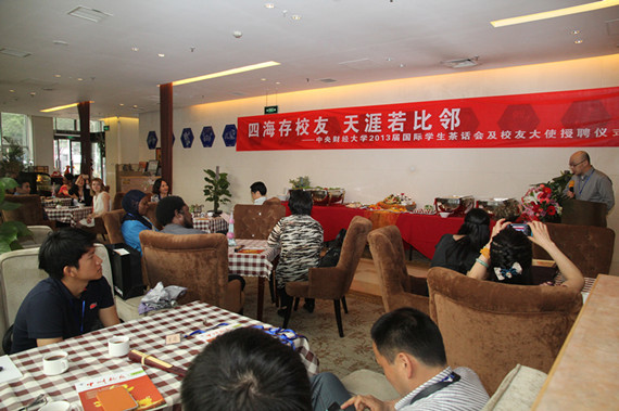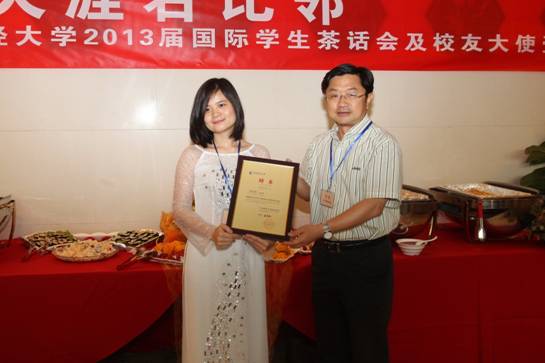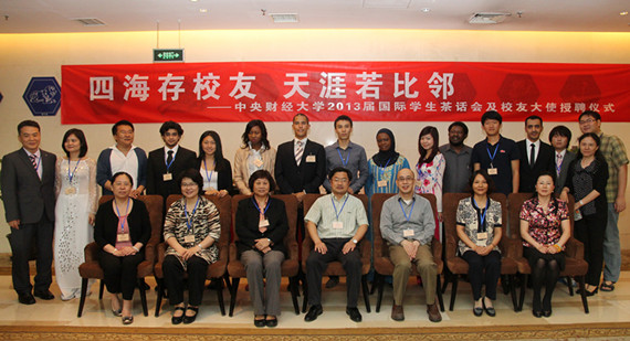 2013年5月28日上午,中财大厦星愿咖啡厅装扮一新,喜气洋洋,我校2013届国际学生校友大使茶话会及聘任仪式在这里举行。校党委副书记、校友总会常务副会长梁勇,77779193永利官网院长张铁刚,国际合作处处长蔡彩时,国际经济与贸易学院院长唐宜红、副院长张晓涛,金融学院副院长陈颖,校友总会秘书长安秀梅、77779193永利官网和校友总会秘书处老师、12名2013届国际学生校友大使以及在读国际学生代表等参加了聘任仪式。仪式由张铁刚院长主持。