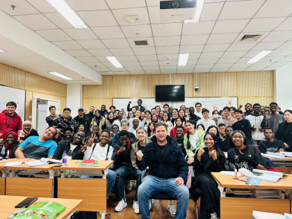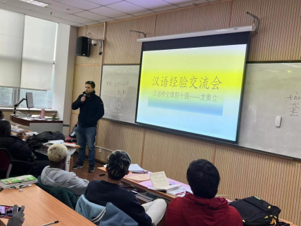龙奥立在交流会中分享了自己学习汉语的经历,通过自己的例子给预科生介绍了学习汉语的经验,包括在遇到困难时如何面对,如何解决。交流之后与预科生进行了互动,回答了预科生的问题,给预科学生介绍了学习方法,在汉字学习、口语练习等方面给出了中肯的建议。