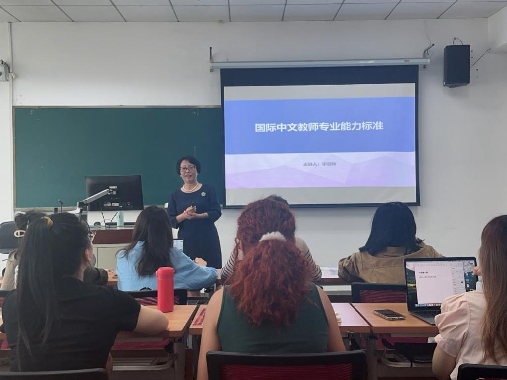 课堂上,李春玲教授首先简要介绍了教育部中外语言交流合作中心组织研制的《国际中文教育中文水平等级标准》《职业中文能力等级标准》《国际中文教师专业能力标准》等各类标准。随后,她从“范围”“研发背景”“相关术语”、“基本理念”“基本内容”“实施建议”“规范性”等七个方面对《国际中文教师专业能力标准》进行了全面而详细的阐述。其中,在“相关术语”部分,重点讲解了本专业名称从“对外汉语教学”到“汉语国际教育”再到“国际中文教育”的演变。在“基本理念”部分,着重强调了“立德树人,师德为先”的理念,并传达了今年全国教育大会的会议精神。