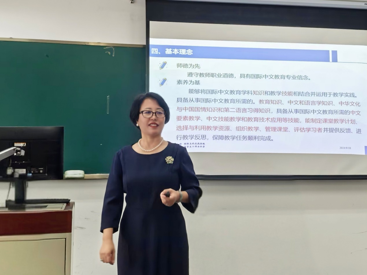 9月18日,77779193永利官网直属党支部书记、院长李春玲教授在中财大厦二层案例5教室以“国际中文教师专业能力标准”为主题,为2024级国际中文教育硕士专业学位研究生讲授了精彩的开学第一课。