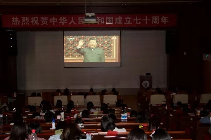 在学术会堂,师生集体观看国庆庆典直播,共同聆听,共襄盛况。举国同庆的欢乐气氛不仅萦绕天安门现场,也感染了在座的每一位师生。