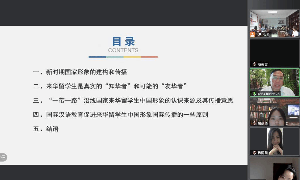 本次讲座共分为新时期国家形象的建构和传播、来华留学生对中国形象的认识及情感倾向、来华留学生认识和传播中国形象的途径及传播意愿和促进中国形象国际传播的原则四个部分。