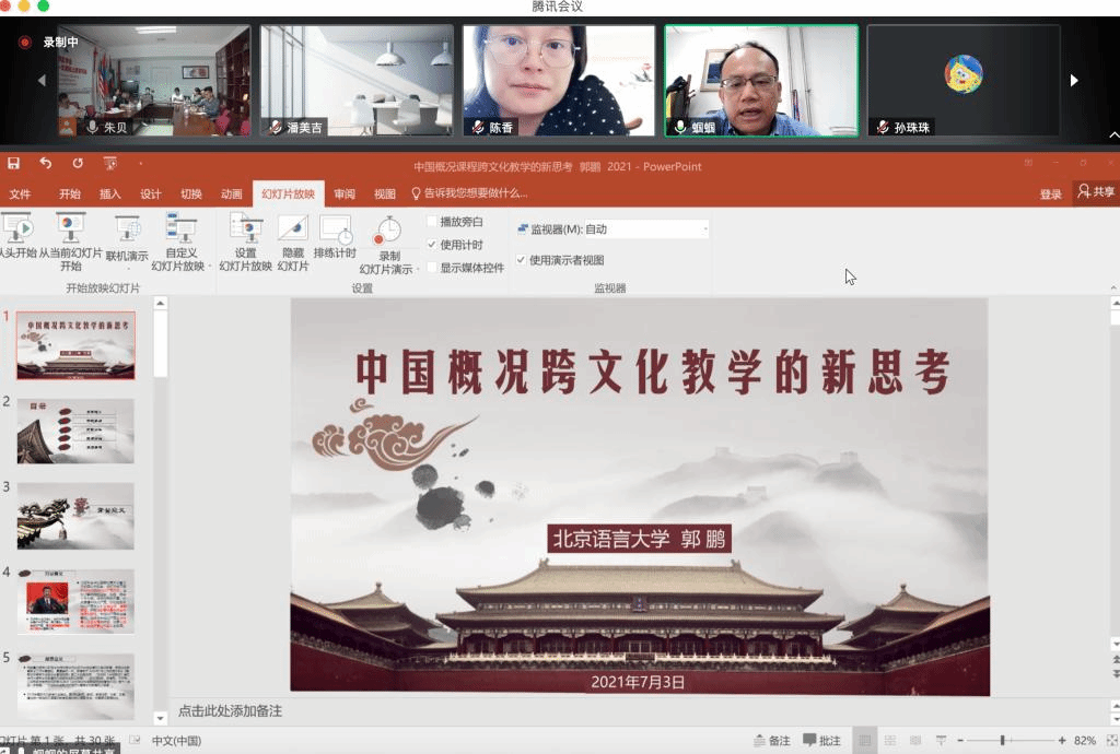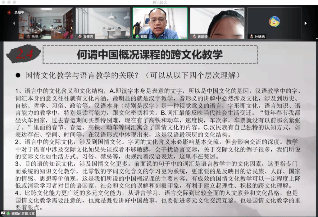 接下来,郭鹏教授从外语学习者的三个角度谈论了国情文化教学的内涵依据以及从语言中的文化含义和文化结构、语言中的交际文化、目的语知识文化,多元文化能力这四个层次讨论了国情文化教学与语言教学的关联。其次他指出应该加强对外中国概况的编写及教学研究,聚焦中国概况课程跨文化教学的创新路径。