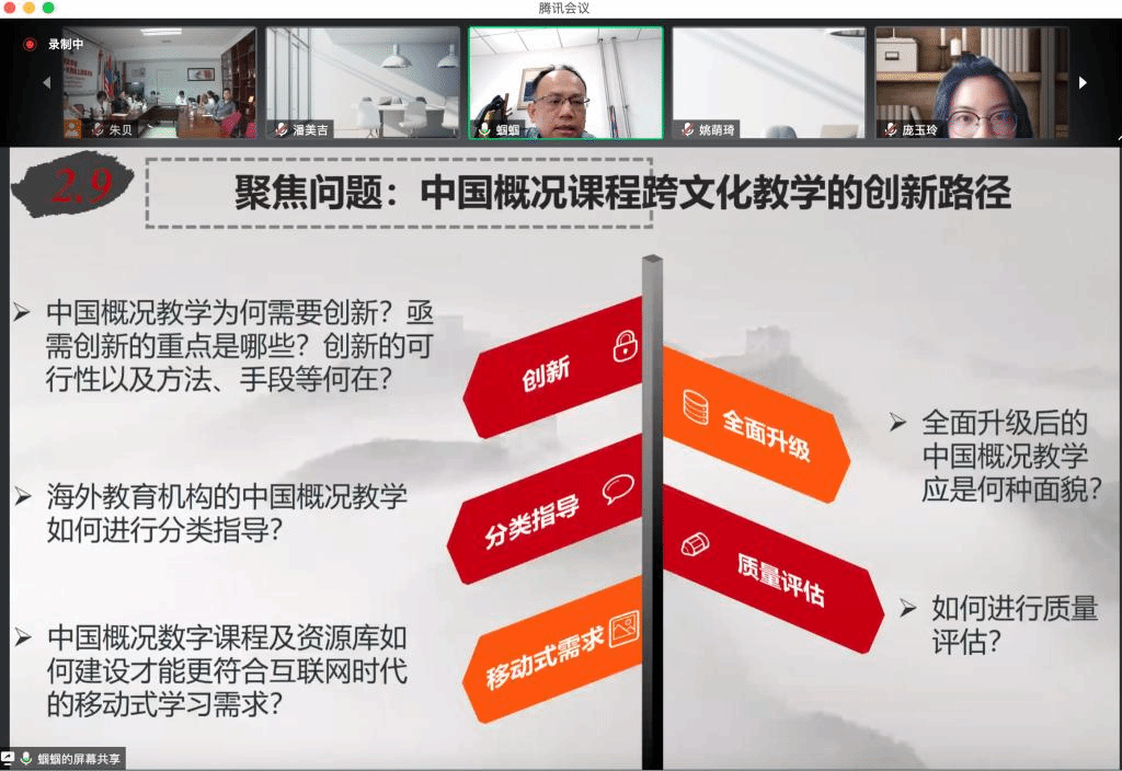紧接着,郭鹏教授强调对于国情文化的教学内容应该进行科学的定位和定量并解决好中国概况教学的共性与个性的对立统一关系,最大程度地实现技术手段从而实现移动生活与教学内容目标的完美结合。