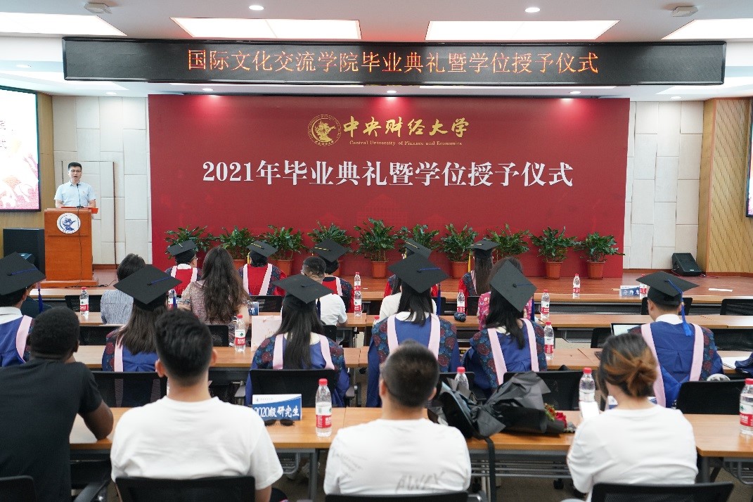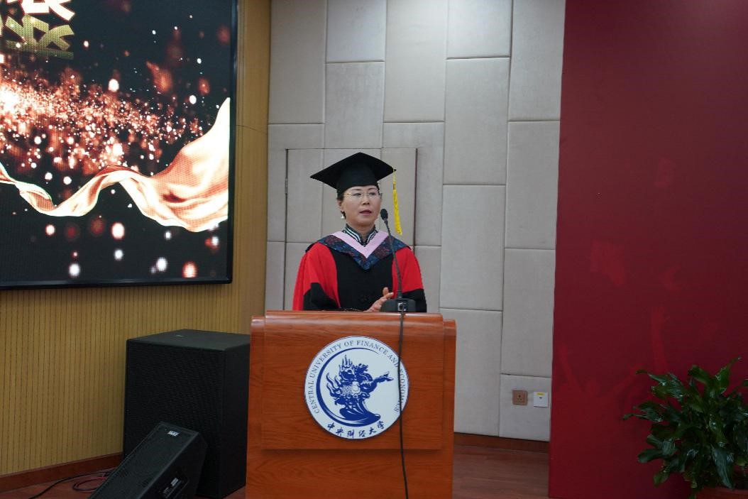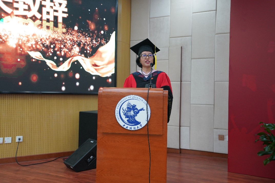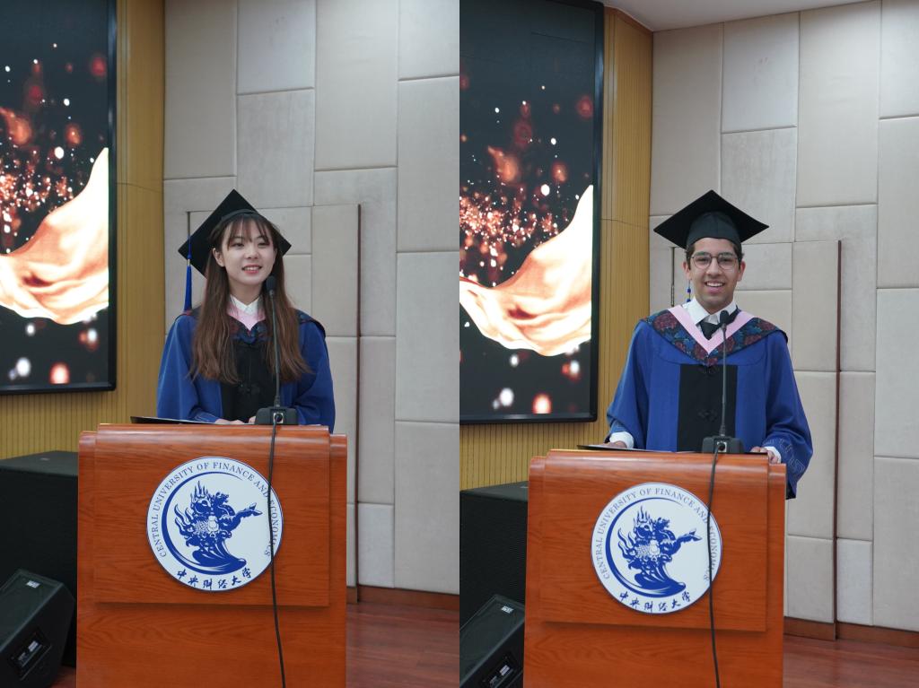 郭沫如和永思源作为毕业生代表依次发言。郭沫如同学表示毕业生将继续填好人生的履历表,不负学院与老师的教诲,勇敢迎接挑战,为母校争光,为学院争光,祝愿大家今后无论身处何方,眼里都永远充满希望和光。永思源同学作为一名留学生,表达了对学院老师的衷心感谢,他呼吁同学们时刻牢记中财大“忠诚、团结、求实、创新”的校训和“龙马担乾坤”的精神,始终关注母校发展,为母校的进步贡献自己的力量。