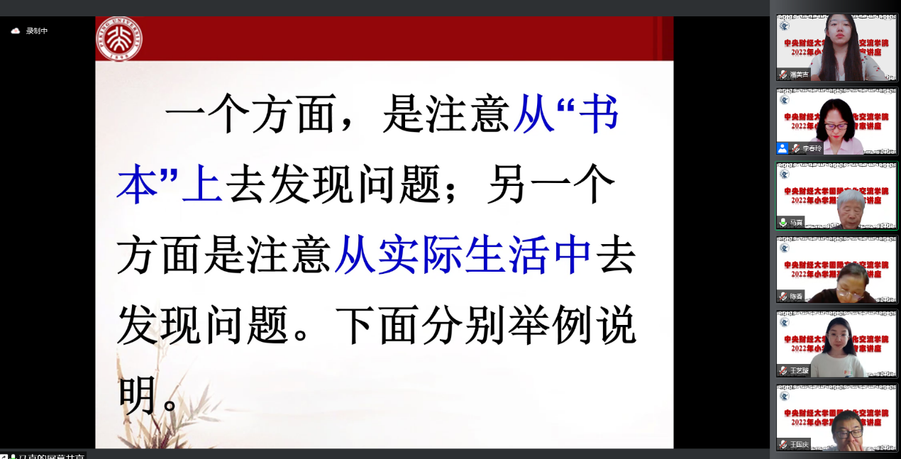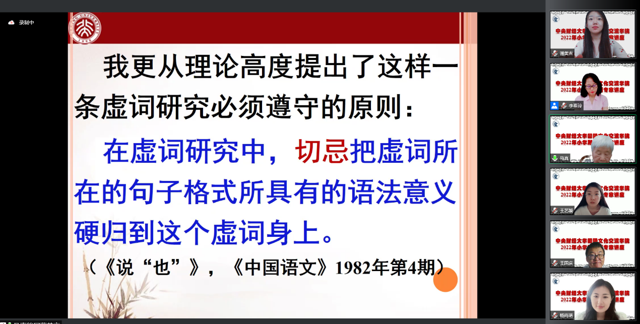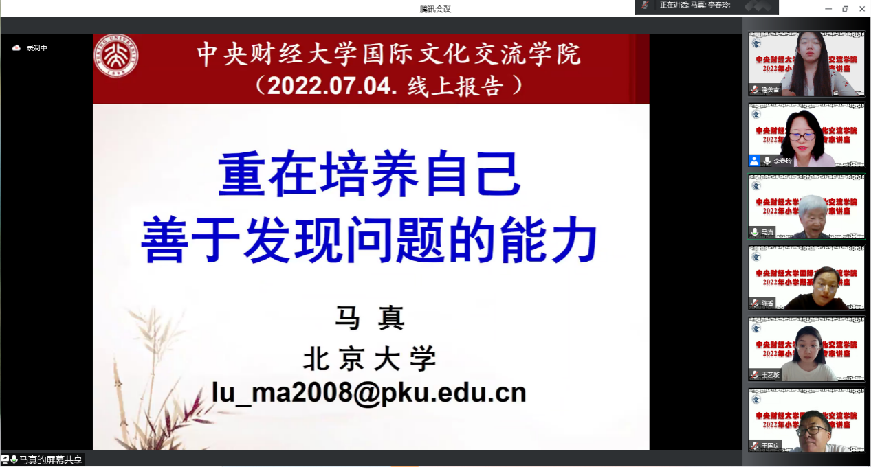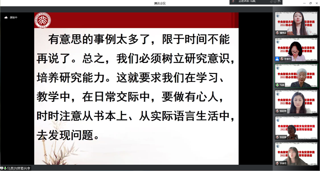 2022年7月4日上午,北京大学中文系马真教授在永利官网成功举办了“重在培养自己善于发现问题的能力”专题线上讲座,拉开永利官网2021-2022学年小学期汉语国际教育专业专家系列讲座的序幕。该场讲座通过腾讯会议平台举行,由77779193永利官网院长李春玲教授主持。永利官网汉语国际教育专业全体硕士生导师、2021级和2022级汉语国际教育硕士专业学位研究生参加了此次讲座。