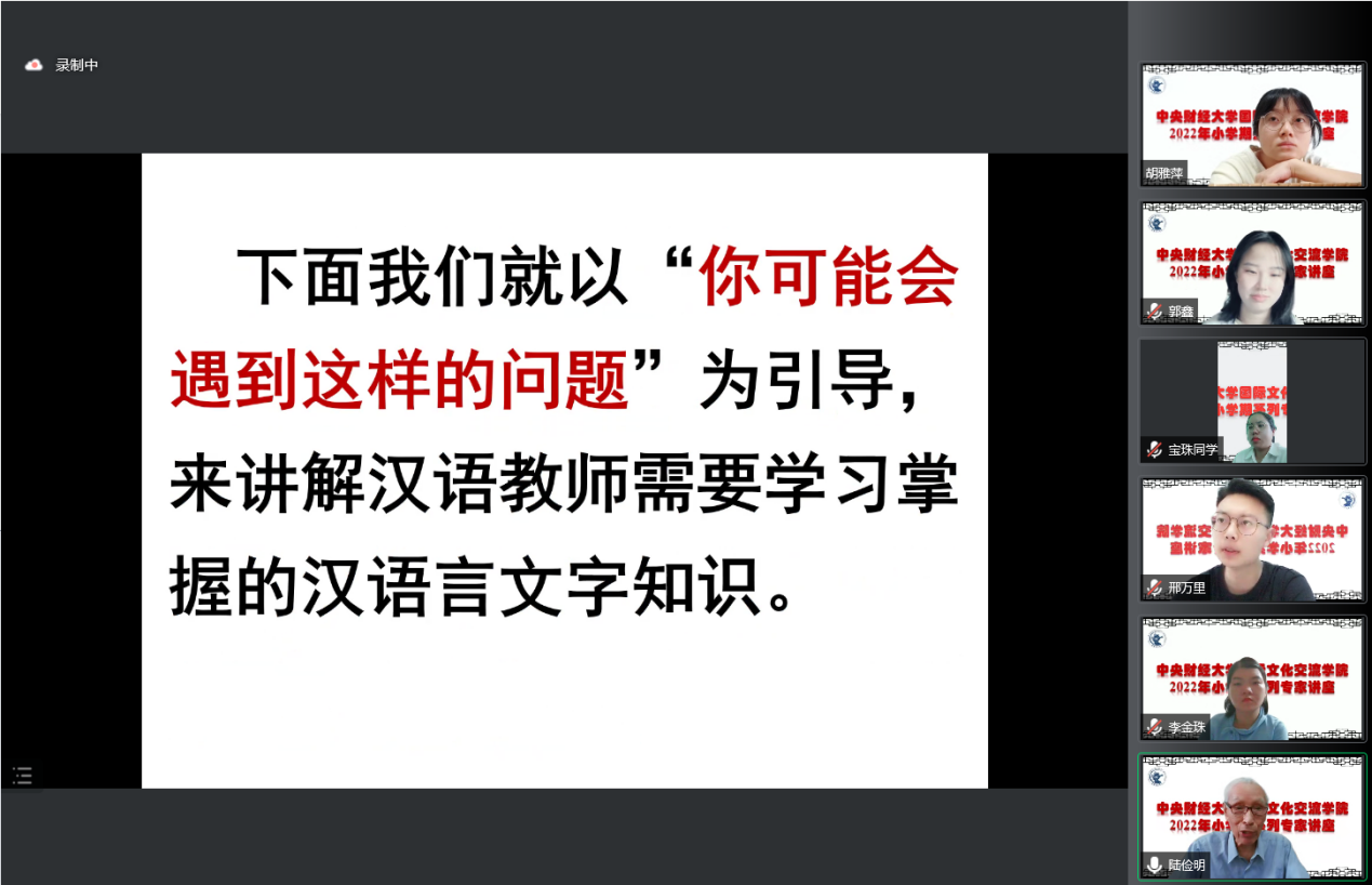 随后,陆俭明教授从汉语教师的角度出发,以“你可能会遇到这样的问题”为引导,从一些常见问题入手,通过提问题的方式引发听众思考,并在讨论中逐一给出答案,由此细致地阐述了关于语音、汉字和词汇等方面的一些重要的汉语言文字知识。