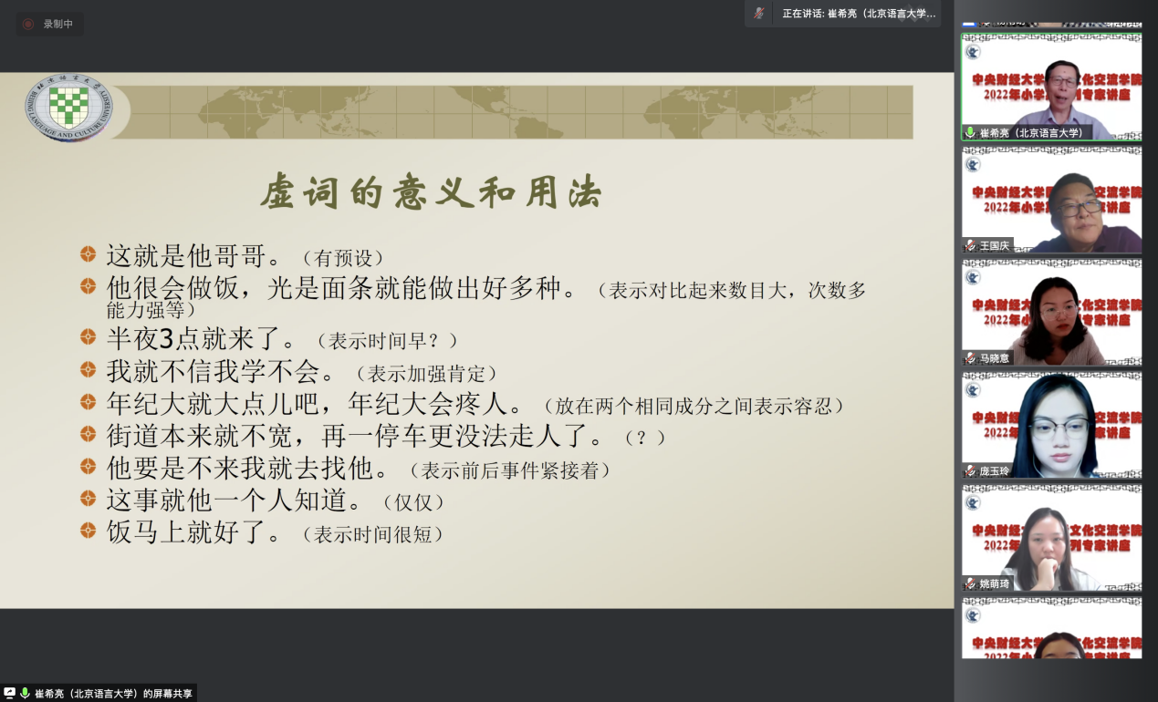 崔希亮教授还从自身经验出发,用实际教学中的例子为大家详细介绍了课堂教学中会碰到的问题,例如虚词的意义和用法、实词的意义和用法、同义词近义词辨析、量词的用法及解释、语气词的情态意义、句式的意义和用法等,并建议大家要利用好现有的语料库资源来获取丰富的语料以加深自己的研究。