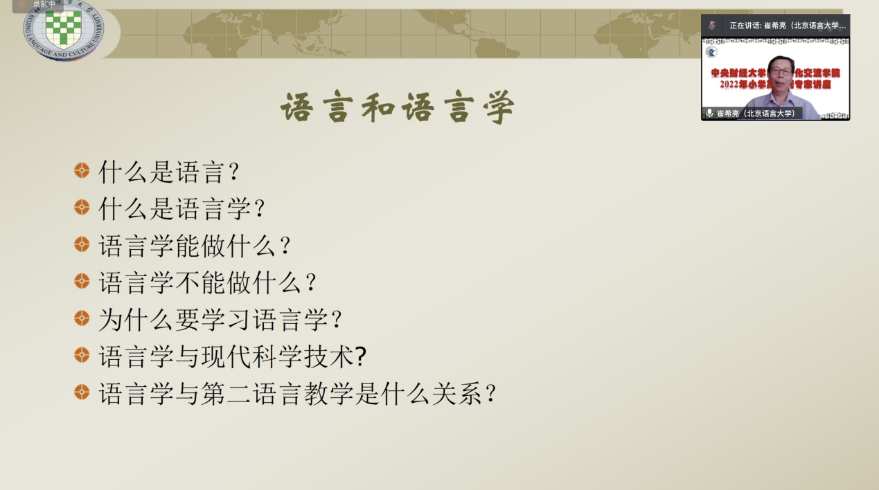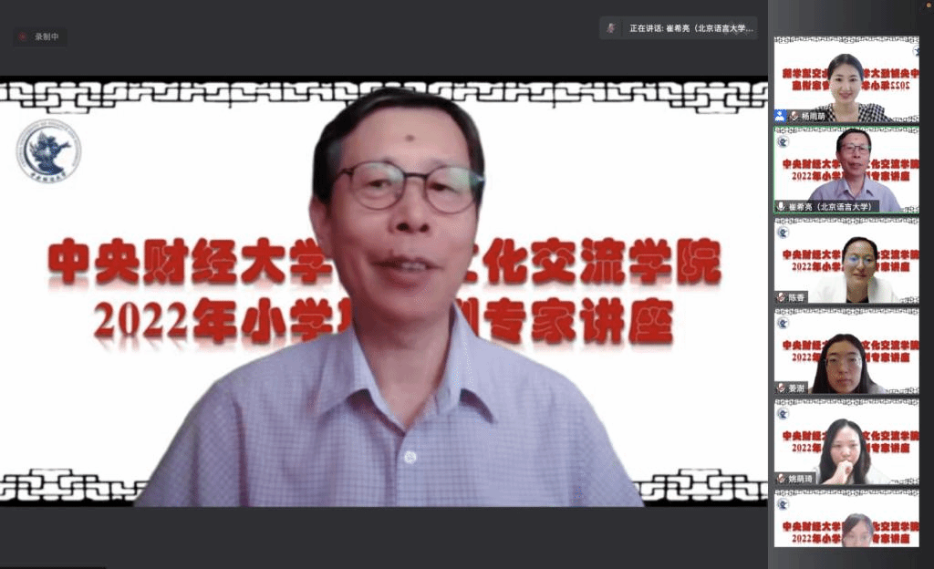 2022年7月6日下午,北京语言大学崔希亮教授在永利官网成功举办了“语言学与语言教学”专题线上讲座。该场讲座在腾讯会议平台上举行,由77779193永利官网院长李春玲教授主持。永利官网汉语国际教育专业全体硕士生导师、2021级和2022级汉语国际教育硕士专业学位研究生参加了此次讲座。