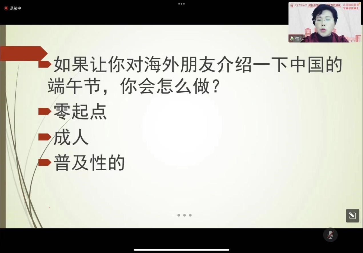 原绍锋教授以“向海外朋友介绍中国端午节”为主题,通过30分钟的公开课,向大家讲解了如何给海外留学生介绍中国传统节日的相关内容,深入浅出地分析了中国文化教学和传播的方法与注意事项。