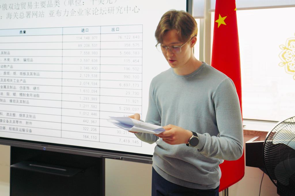俄罗斯籍国际学生鲁斯兰作为学生代表发言,回顾了中俄两国关系的发展历程和经贸合作背景,介绍了两国双边贸易情况。他表示,“作为国际商务专业的留学生,我希望能够多接触中国的年轻人,了解中国新的发展趋势。中俄两国青年人应该加强沟通与交流,为推动中俄经济和贸易合作高质量发展,全面推进双边合作做出自己的贡献”。